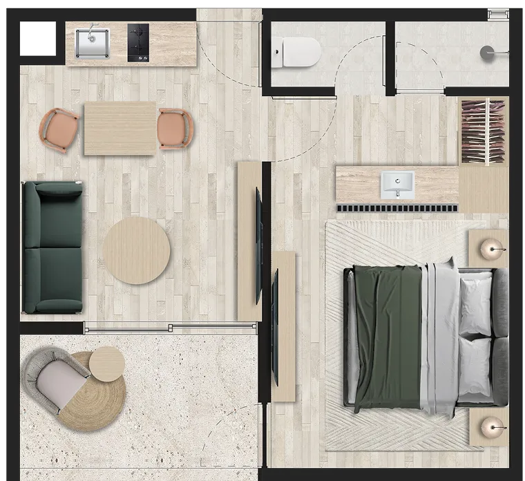 Este exclusivo departamento de una recámara dispone de acabados de primera calidad. ¡Cada espacio ha sido cuidadosamente creado para brindar una experiencia de relajación inolvidable!